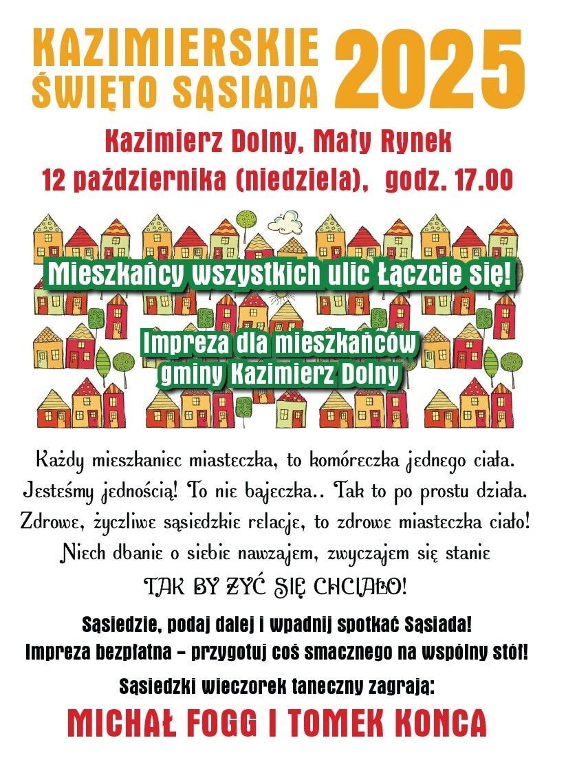 Serdecznie zapraszamy Cię na kolejną edycję Kazimierskiego Święta Sąsiada 2025, organizowanego przez sąsiadów i dla sąsiadów. Lokalne relacje są chlebem i solą każdej społeczności.