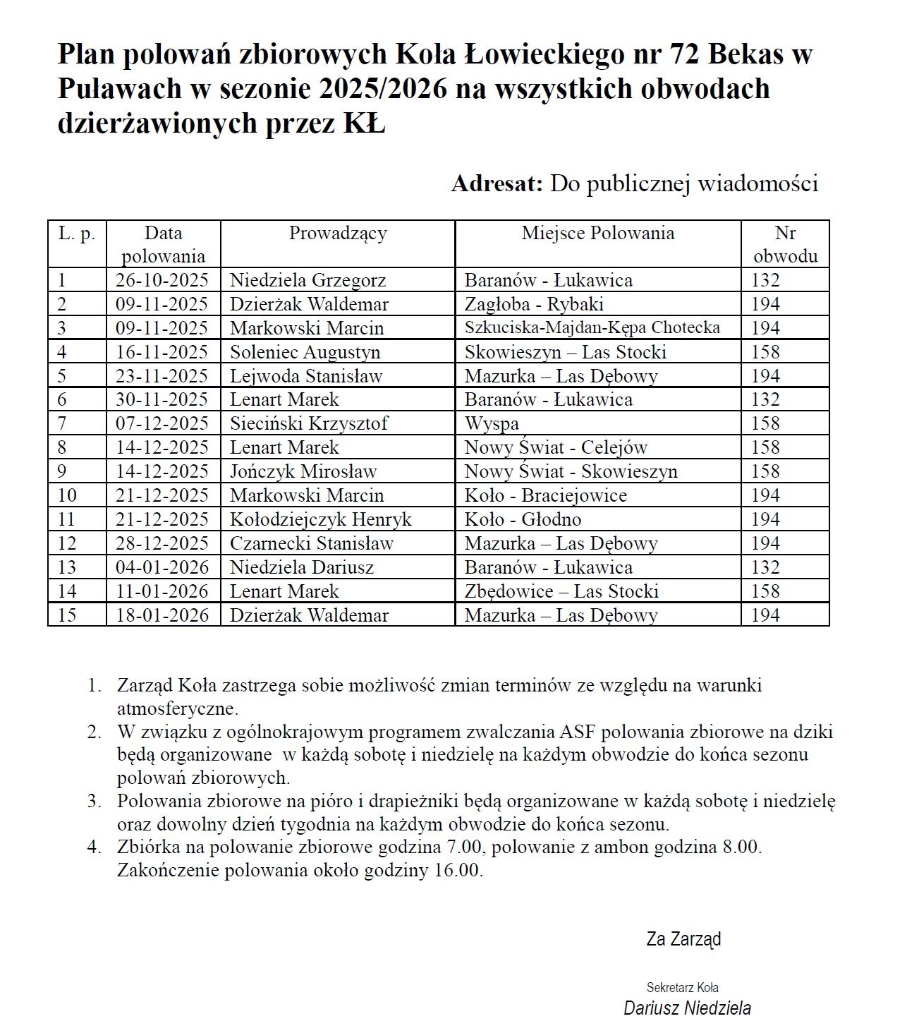 Poniżej przedstawiamy plan polowań zbiorowych Koła Łowieckiego nr 72 Bekas w Puławach w sezonie 2025/2026 na wszystkich obwodach dzierżawionych przez KŁ.