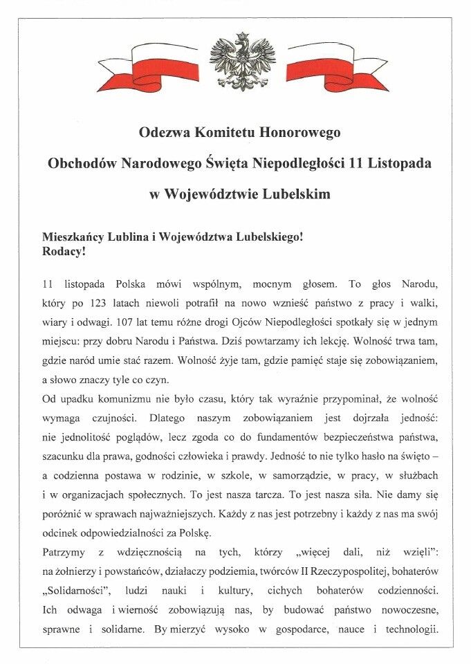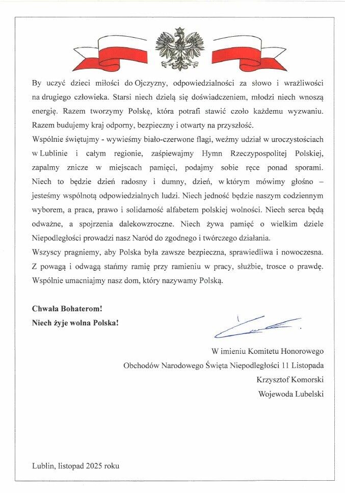 11 listopada Polska mówi wspólnym, mocnym głosem. To głos Narodu, który po 123 latach niewoli potrafił na nowo wznieść państwo z pracy i walki, wiary i odwagi. 107 lat temu różne drogi Ojców Niepodległości spotkały się w jednym miejscu: przy dobru Narodu i Państwa. Dziś powtarzamy ich lekcję. Wolność trwa tam, gdzie naród umie stać razem. Wolność żyje tam, gdzie pamięć staje się zobowiązaniem, a słowo znaczy tyle co czyn.