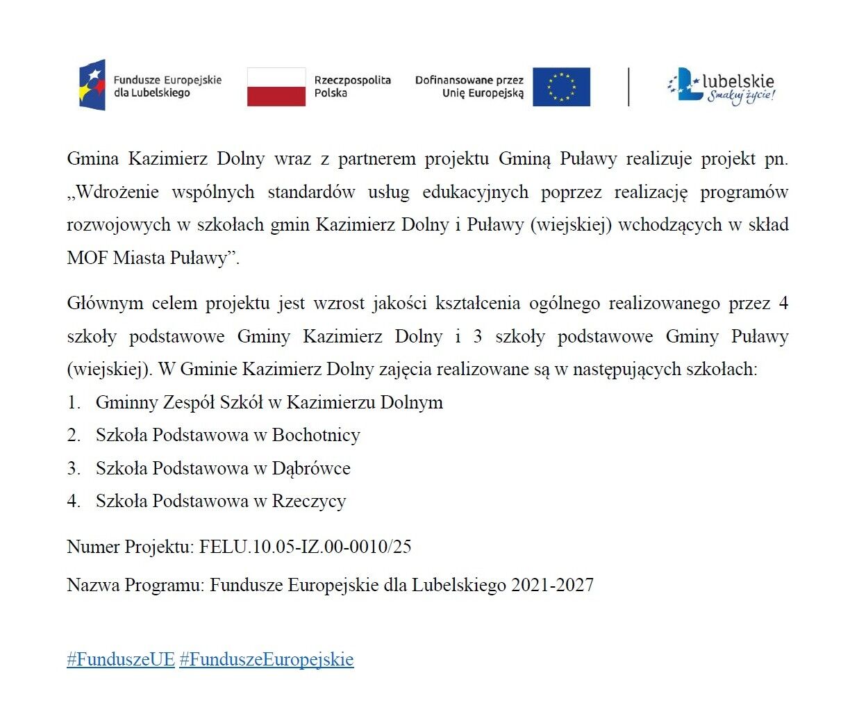 Gmina Kazimierz Dolny wraz z partnerem projektu Gminą Puławy realizuje projekt pn. „Wdrożenie wspólnych standardów usług edukacyjnych poprzez realizację programów rozwojowych w szkołach gmin Kazimierz Dolny i Puławy (wiejskiej) wchodzących w skład MOF Miasta Puławy”.