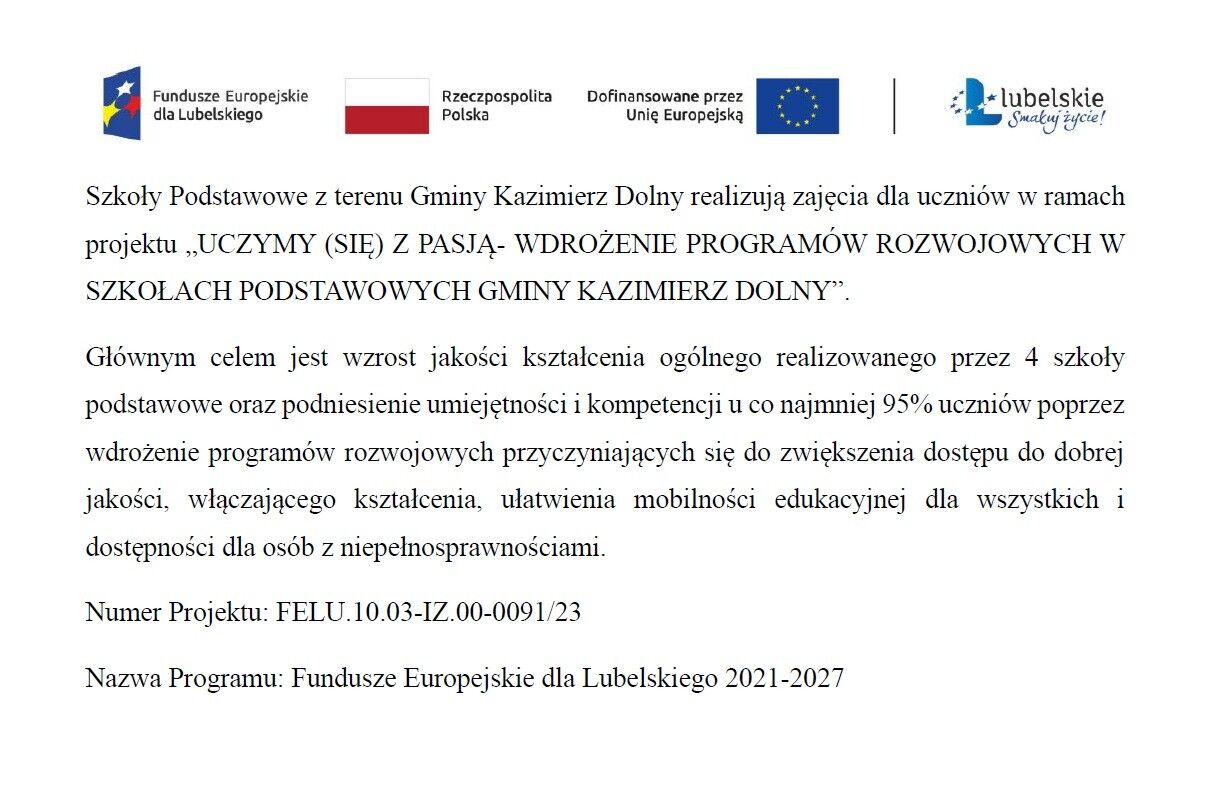 Szkoły Podstawowe z terenu Gminy Kazimierz Dolny realizują zajęcia dla uczniów w ramach projektu „UCZYMY (SIĘ) Z PASJĄ- WDROŻENIE PROGRAMÓW ROZWOJOWYCH W SZKOŁACH PODSTAWOWYCH GMINY KAZIMIERZ DOLNY”.