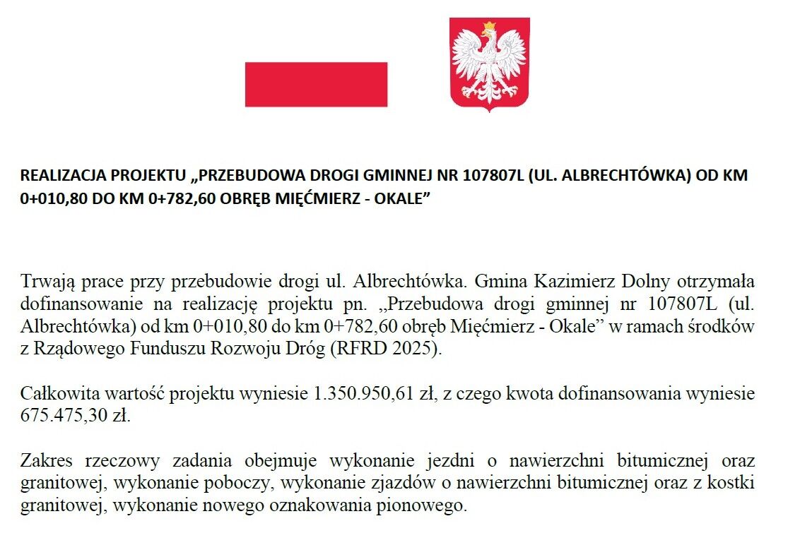 Trwają prace przy przebudowie drogi ul. Albrechtówka. Gmina Kazimierz Dolny otrzymała dofinansowanie na realizację projektu pn. „Przebudowa drogi gminnej nr 107807L (ul. Albrechtówka) od km 0+010,80 do km 0+782,60 obręb Mięćmierz - Okale” w ramach środków z Rządowego Funduszu Rozwoju Dróg (RFRD 2025).