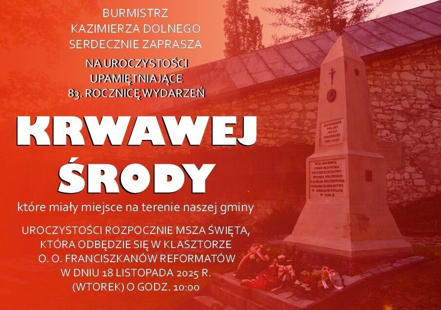 We wtorek 18 listopada 2025 r. o godzinie 10:00 w Klasztorze Franciszkanów rozpoczną się uroczystości upamiętniające 83. rocznicę wydarzeń "Krwawej Środy".